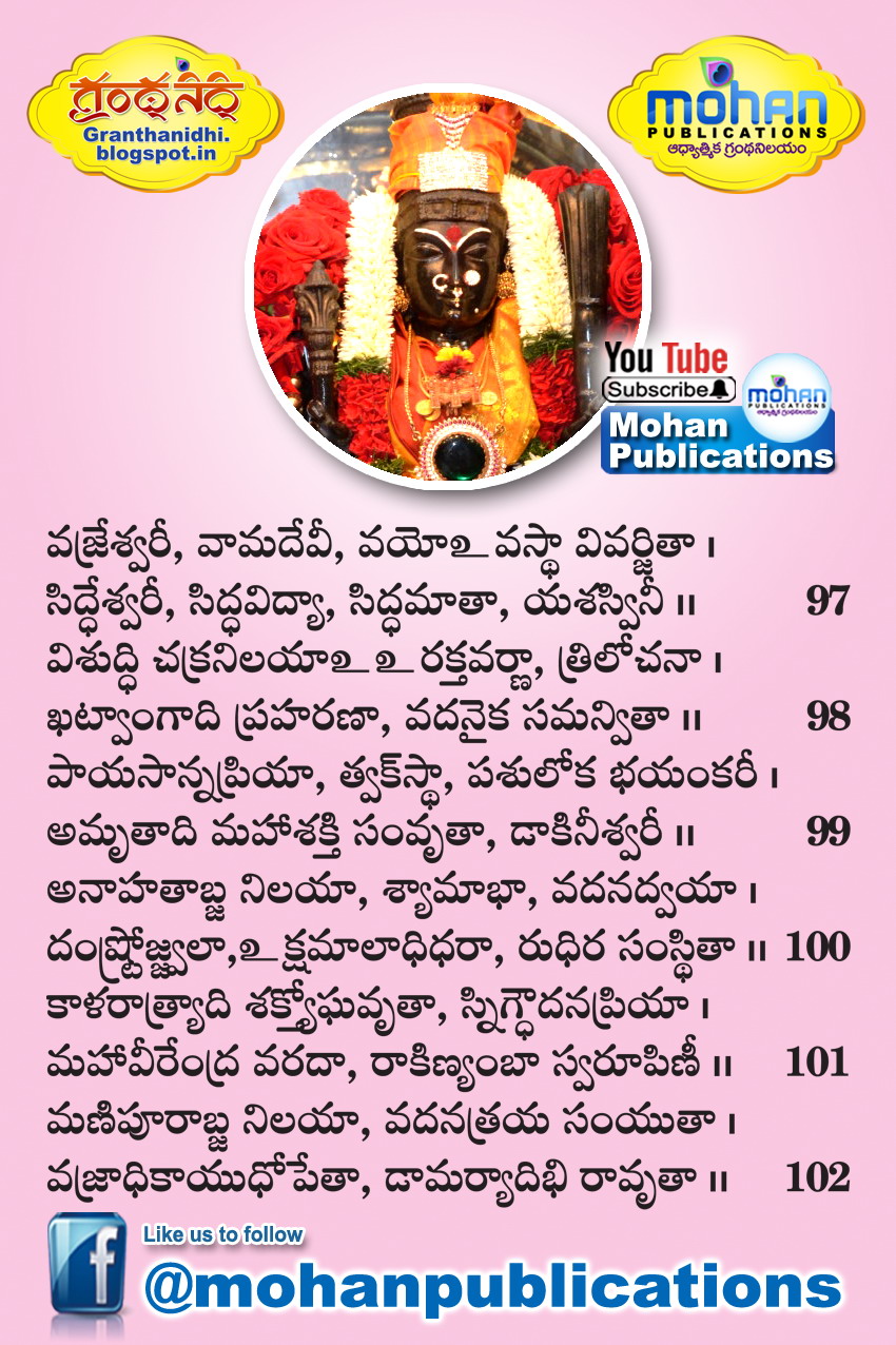 ఏ పేరిట పిలిస్తే, ఆ తల్లి పలుకు తుందో ఆ పేర్లన్నీ హయగ్రీవుని అశ్వకంఠముతో ఆశువ్ఞగా వస్తాయి. ఈనామ సహస్రమే లలితా సహస్రం. ఇవి వేయినామాలు. ఇందులో కామాక్షి,పార్వతి, దుర్గ, మహాకాళి, సరస్వతి, భవాని, నారాయణి, కల్యాణి, రాజరాజేశ్వరి మహాత్రిపురసుందరి, వైష్ణవి, మహేశ్వరి, చండికా, విశాలాక్షి, గాయిత్రి అనేక దేవి రూపాలు కనపడతాయి. శ్రీలలితా సహస్రనామములు కేవలం స్తోత్రం కాదు. ఇది గొప్ప శాస్త్రము. గొప్ప ప్రమాణం. ఈ వేయినామాలు 183 శ్లోకములలో చెప్పబడినవి. ‘శ్రీమాతా అను నామముతో మొదలై లలితాంబికా అనునామముతో పూర్తవ్ఞతుంది. విడివిడిగా చదువ్ఞతే ఓం శ్రీమాత్రేనమః అని చదవాలి. అర్థము తెలుసుకునే చదవాలి. అలా వీలుకానప్పుడు నామజపము వలె చదవాలి.
